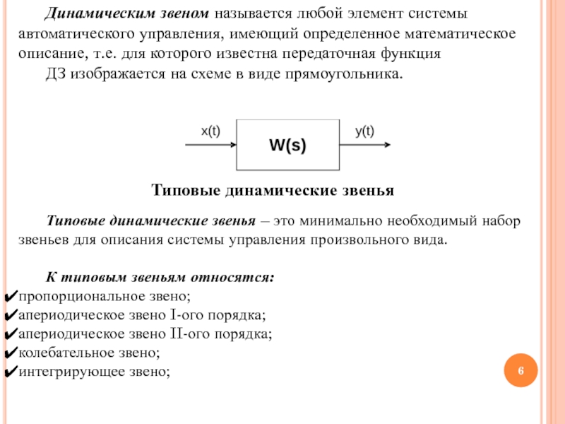 Слайд 6Динамическим звеном называется любой элемент системы автоматического управления, имеющий определенное