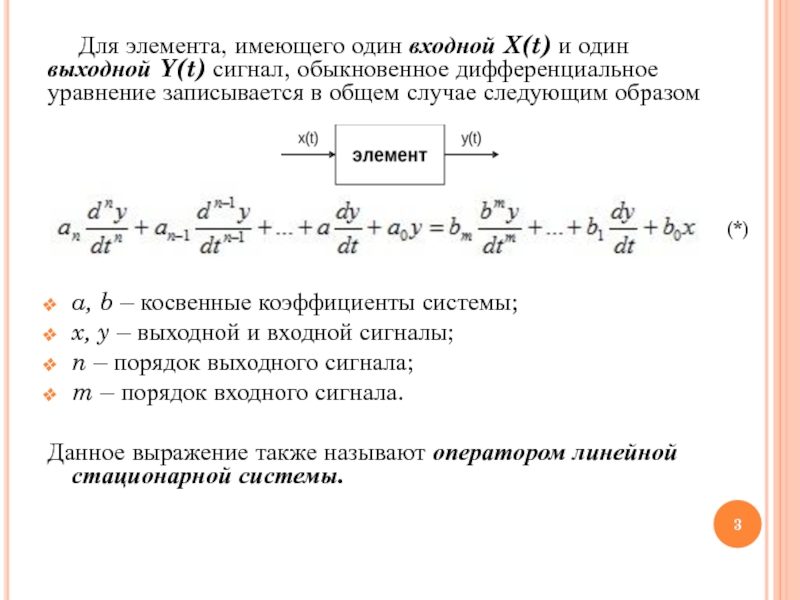 Слайд 3Для элемента, имеющего один входной X(t) и один выходной Y(t) сигнал, обыкновенное дифференциальное уравнение