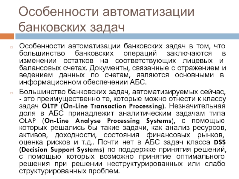 Большинство банковских задач, автоматизируемых сейчас, - это преимущественно те, которые можно отнести к классу задач OLTP (Оn-Line Transaction Processing). Незначительная доля в АБС принадлежит аналитическим задачам типа OLAP (On-Line Analyse Processing Systems), с помощью которых решались бы такие задачи, как анализ ресурсов, активов, доходности, состояния финансовых рынков, оценка рисков и т.д.. Почти нет в АБС задач класса DSS (Decision Support Systems) по поддержке принятия решений, с помощью которых возможно принятие оптимального решения при решении неструктурированных или слабо структурированных проблем.