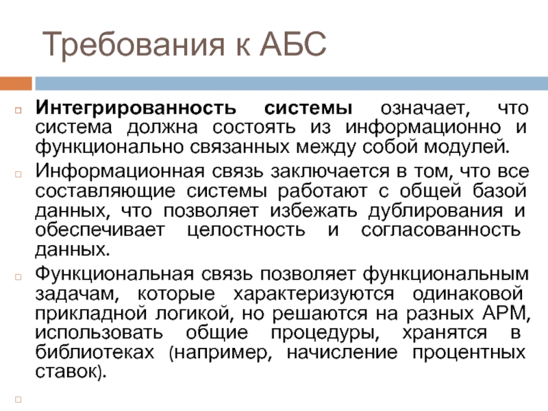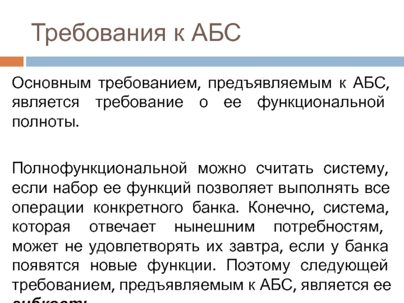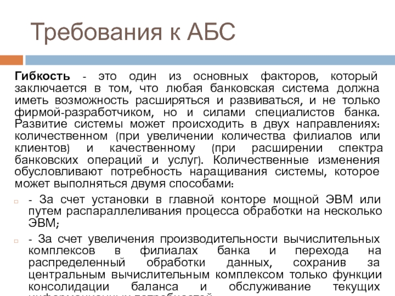 функций позволяет выполнять все операции конкретного банка. Конечно, система, которая отвечает нынешним потребностям, может не удовлетворять их завтра, если у банка появятся новые функции. Поэтому следующей требованием, предъявляемым к АБС, является ее гибкость.