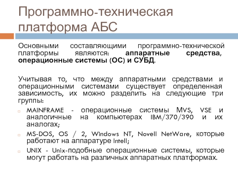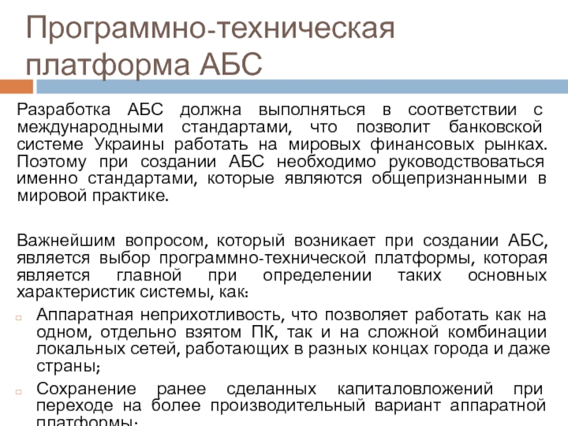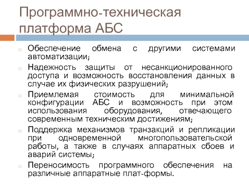 Важнейшим вопросом, который возникает при создании АБС, является выбор программно-технической платформы, которая является главной при определении таких основных характеристик системы, как: