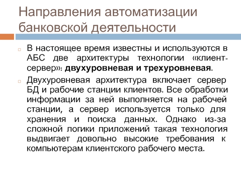 в АБС две архитектуры технологии «клиент-сервер»: двухуровневая и трехуровневая.