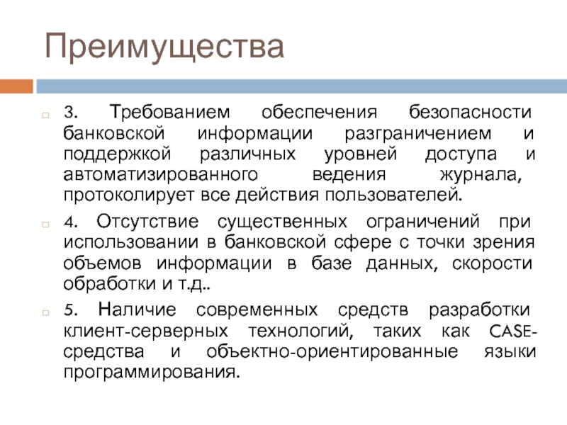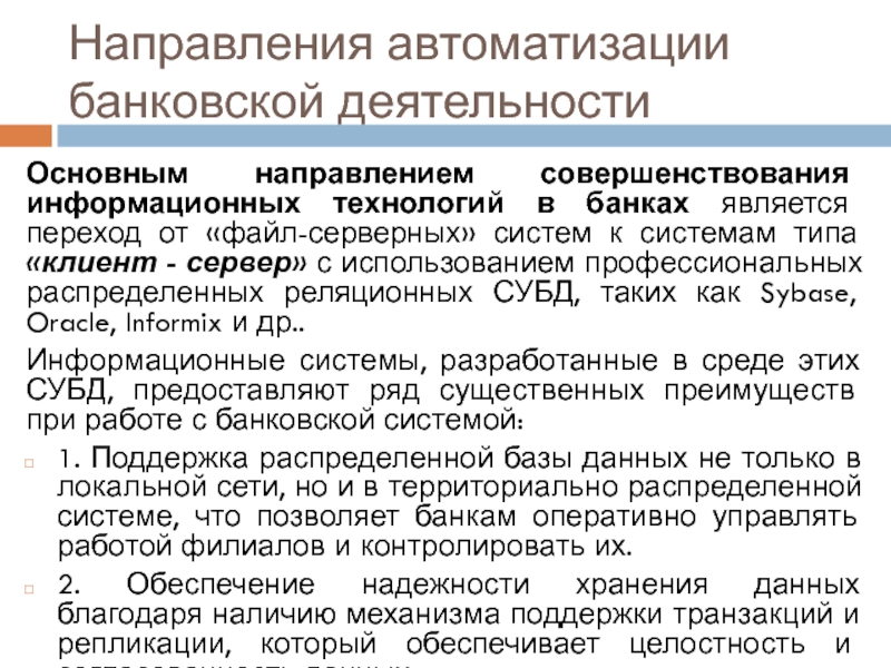 Информационные системы, разработанные в среде этих СУБД, предоставляют ряд существенных преимуществ при работе с банковской системой: