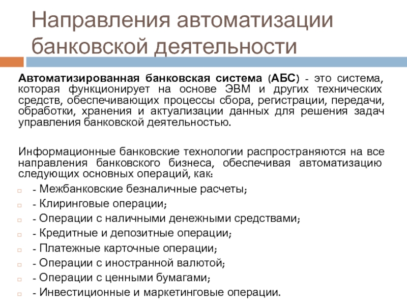 Информационные банковские технологии распространяются на все направления банковского бизнеса, обеспечивая автоматизацию следующих основных операций, как: