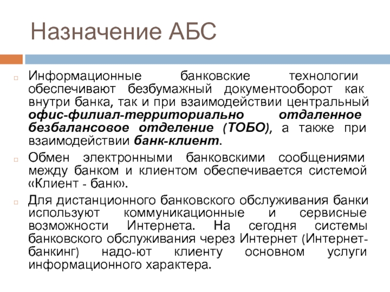 так и при взаимодействии центральный офис-филиал-территориально отдаленное безбалансовое отделение (ТОБО),