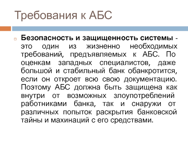 жизненно необходимых требований, предъявляемых к АБС. По оценкам западных специалистов,