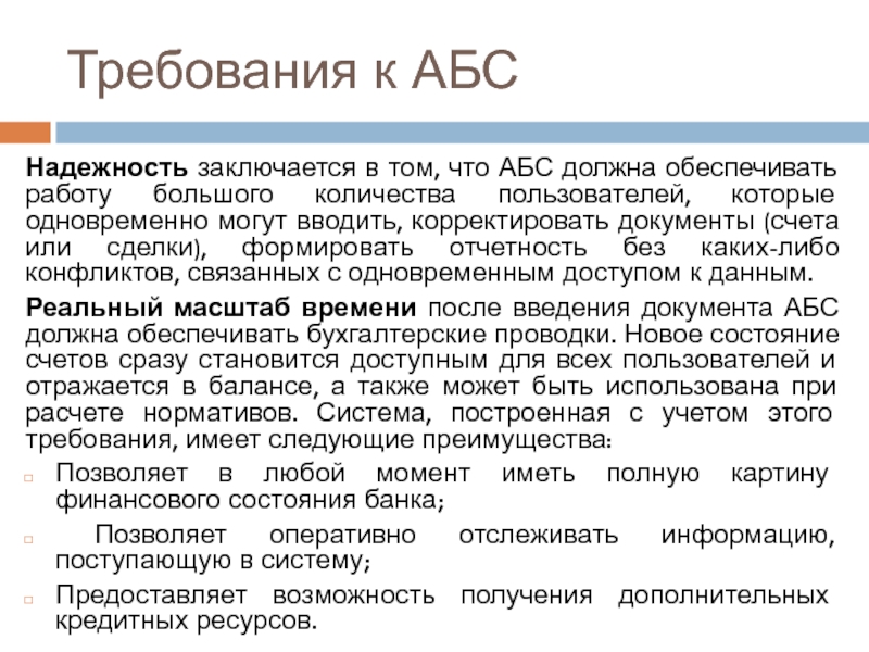 Реальный масштаб времени после введения документа АБС должна обеспечивать бухгалтерские проводки. Новое состояние счетов сразу становится доступным для всех пользователей и отражается в балансе, а также может быть использована при расчете нормативов. Система, построенная с учетом этого требования, имеет следующие преимущества: