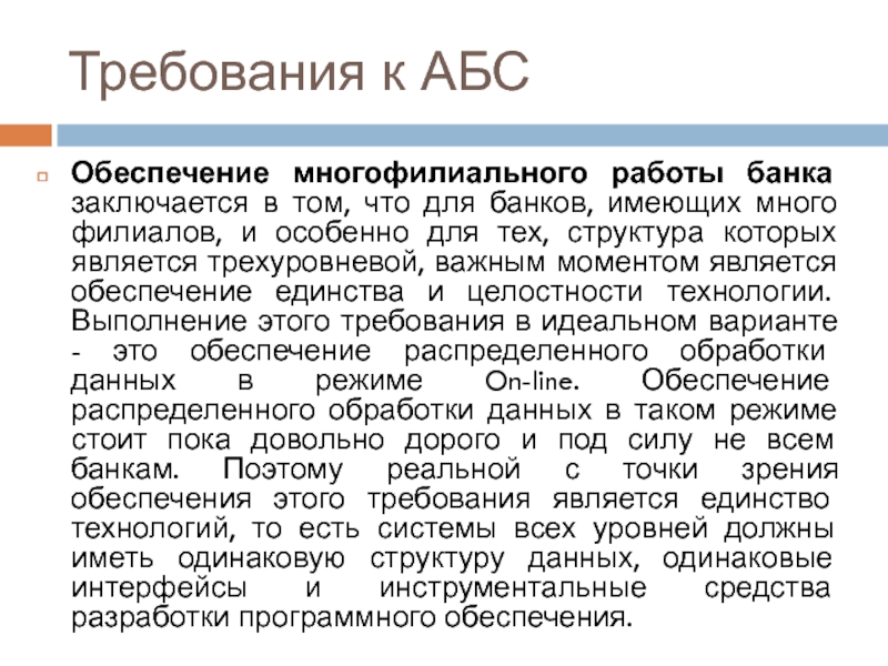 которых является трехуровневой, важным моментом является обеспечение единства и целостности технологии. Выполнение этого требования в идеальном варианте - это обеспечение распределенного обработки данных в режиме On-line. Обеспечение распределенного обработки данных в таком режиме стоит пока довольно дорого и под силу не всем банкам. Поэтому реальной с точки зрения обеспечения этого требования является единство технологий, то есть системы всех уровней должны иметь одинаковую структуру данных, одинаковые интерфейсы и инструментальные средства разработки программного обеспечения.