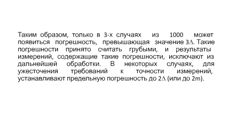 3∆. Такие погрешности принято считать грубыми, и результаты измерений, содержащие такие погрешности, исключают из дальнейшей обработки. В некоторых случаях, для ужесточения требований к точности измерений, устанавливают предельную погрешность до 2∆ (или до 2m).