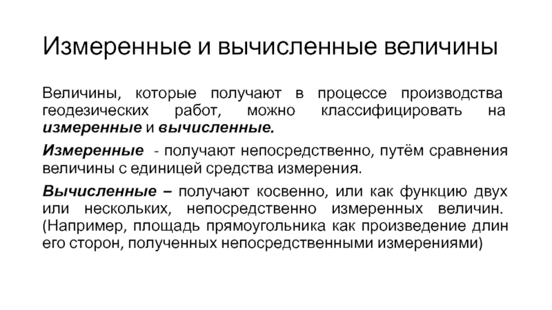 Вычисленные – получают косвенно, или как функцию двух или нескольких, непосредственно измеренных величин. (Например, площадь прямоугольника как произведение длин его сторон, полученных непосредственными измерениями)