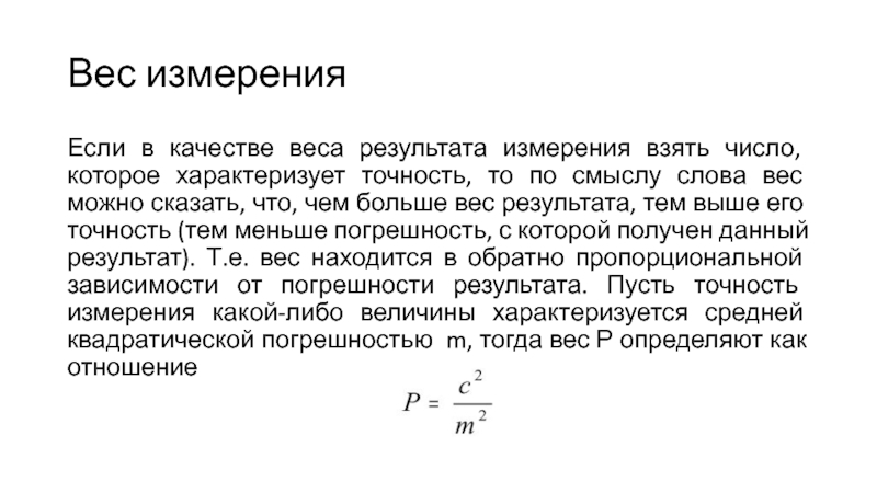 чем больше вес результата, тем выше его точность (тем меньше погрешность, с которой получен данный результат). Т.е. вес находится в обратно пропорциональной зависимости от погрешности результата. Пусть точность измерения какой-либо величины характеризуется средней квадратической погрешностью m, тогда вес Р определяют как отношение
