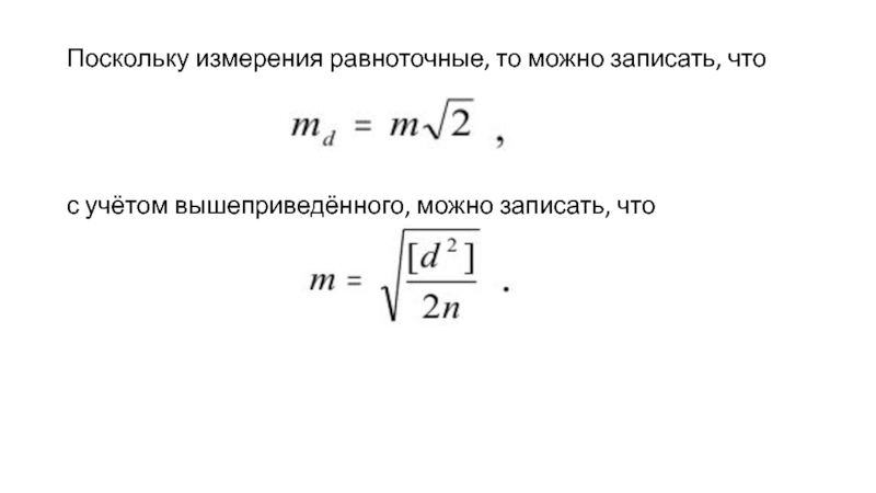 Слайд 32Поскольку измерения равноточные, то можно записать, что