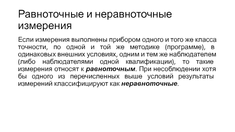 в одинаковых внешних условиях, одним и тем же наблюдателем (либо наблюдателями одной квалификации), то такие измерения относят к равноточным. При несоблюдении хотя бы одного из перечисленных выше условий результаты измерений классифицируют как неравноточные.