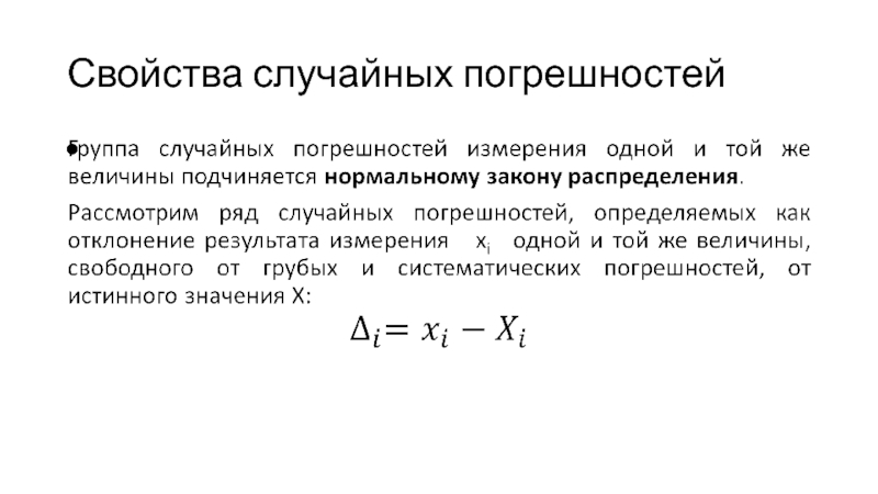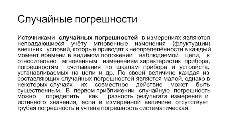которые приводят к неопределённости в каждый момент времени в видимом положении наблюдаемой цели, к относительно мгновенным изменениям характеристик прибора, погрешностям считывания по шкалам прибора и устройств, устанавливаемых на цели и др. По своей величине каждая из составляющих случайных погрешностей является малой, однако в некоторых случаях их совместное действие может быть существенным. В первом приближении случайную погрешность можно определить как разность результата измерения и истинного значения, если в измеренной величине отсутствует грубая погрешность и учтена погрешность систематическая.