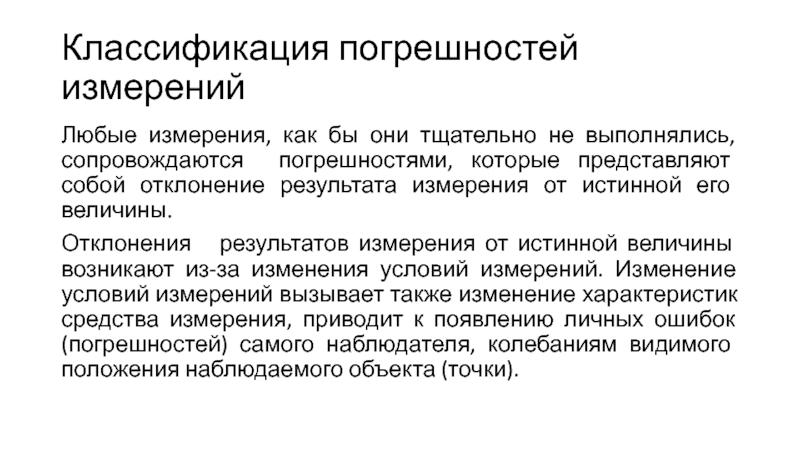 Отклонения результатов измерения от истинной величины возникают из-за изменения условий измерений. Изменение условий измерений вызывает также изменение характеристик средства измерения, приводит к появлению личных ошибок (погрешностей) самого наблюдателя, колебаниям видимого положения наблюдаемого объекта (точки).