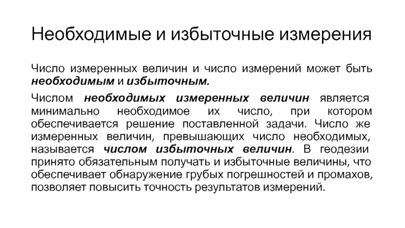 их число, при котором обеспечивается решение поставленной задачи. Число же измеренных величин, превышающих число необходимых, называется числом избыточных величин. В геодезии принято обязательным получать и избыточные величины, что обеспечивает обнаружение грубых погрешностей и промахов, позволяет повысить точность результатов измерений.