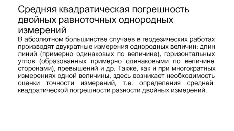 (примерно одинаковых по величине), горизонтальных углов (образованных примерно одинаковыми по величине сторонами), превышений и др. Также, как и при многократных измерениях одной величины, здесь возникает необходимость оценки точности измерений, т.е. определения средней квадратической погрешности разности двойных измерений.