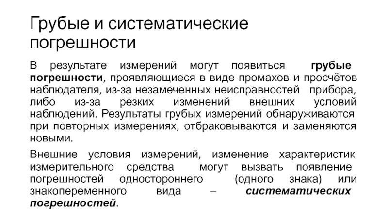 Внешние условия измерений, изменение характеристик измерительного средства могут вызвать появление погрешностей одностороннего (одного знака) или знакопеременного вида – систематических погрешностей.