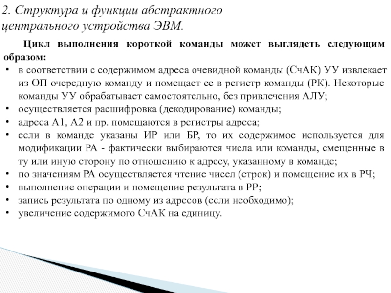 команду и помещает ее в регистр команды (РК). Некоторые команды УУ обрабатывает самостоятельно, без привлечения АЛУ;