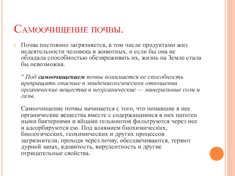 ^ Под самоочищением почвы понимается ее способность превращать опасные в эпидемиологическом отношении органические вещества в неорганические — минеральные соли и газы.