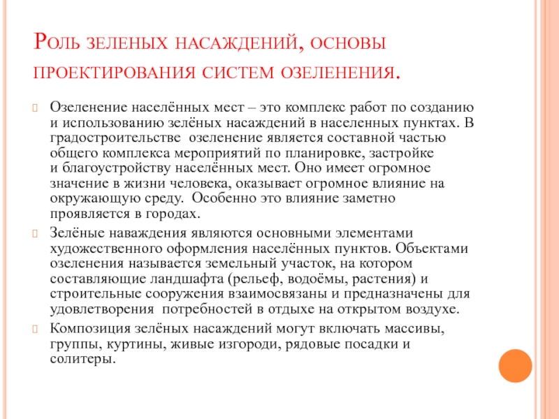 Слайд 20Роль зеленых насаждений, основы проектирования систем озеленения.