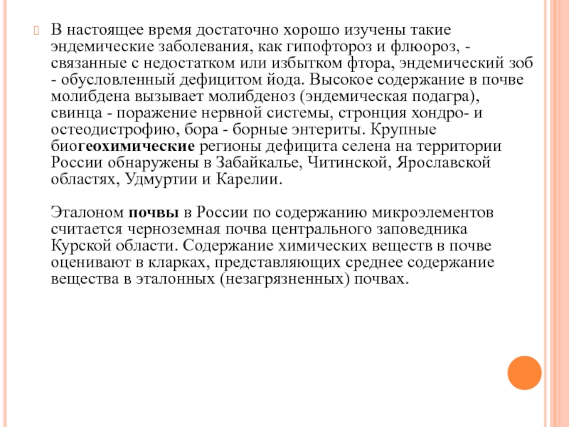 эндемический зоб - обусловленный дефицитом йода. Высокое содержание в почве молибдена вызывает молибденоз (эндемическая подагра), свинца - поражение нервной системы, стронция хондро- и остеодистрофию, бора - борные энтериты. Крупные биогеохимические регионы дефицита селена на территории России обнаружены в Забайкалье, Читинской, Ярославской областях, Удмуртии и Карелии.