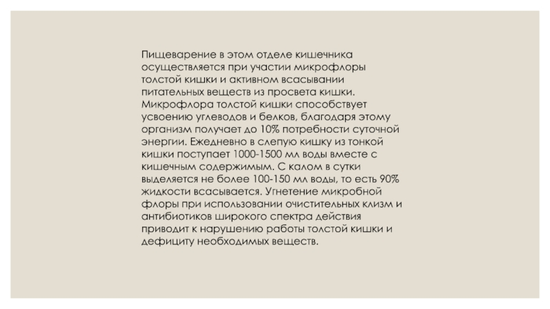 толстой кишки способствует усвоению углеводов и белков, благодаря этому организм получает до 10% потребности суточной энергии. Ежедневно в слепую кишку из тонкой кишки поступает 1000-1500 мл воды вместе с кишечным содержимым. С калом в сутки выделяется не более 100-150 мл воды, то есть 90% жидкости всасывается. Угнетение микробной флоры при использовании очистительных клизм и антибиотиков широкого спектра действия приводит к нарушению работы толстой кишки и дефициту необходимых веществ.