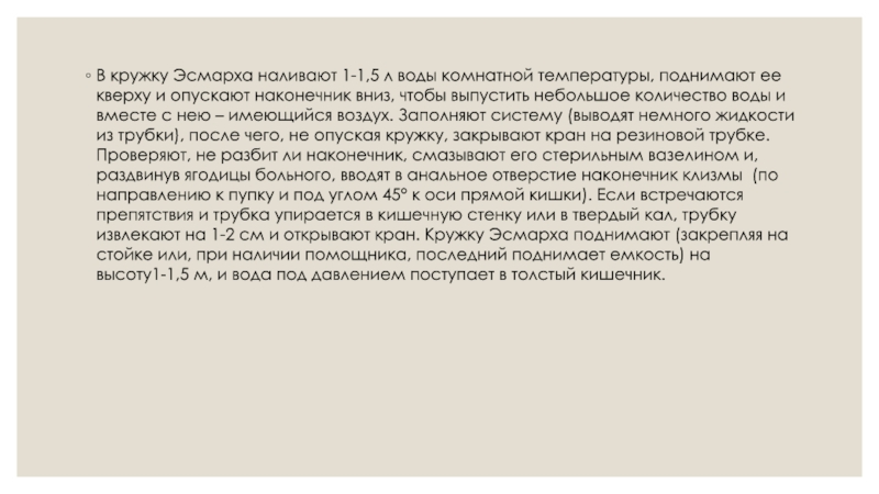 Слайд 16В кружку Эсмарха наливают 1-1,5 л воды комнатной температуры, поднимают