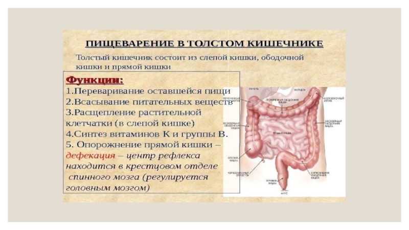 Слайд 7Пищеварение в этом отделе кишечника осуществляется при участии микрофлоры толстой