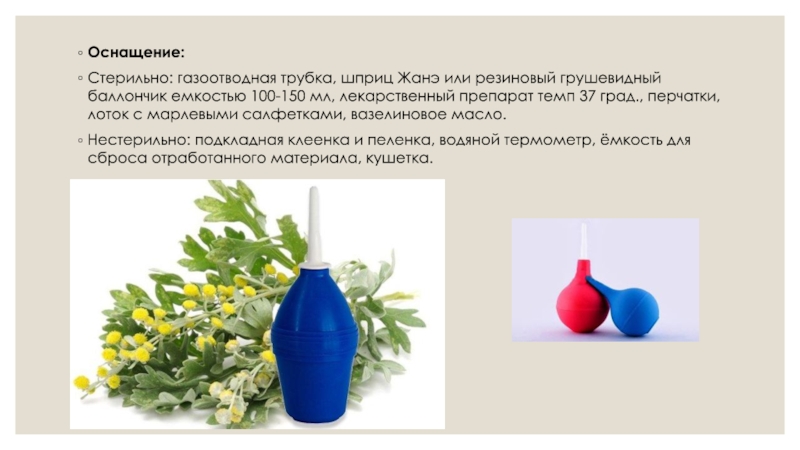 Нестерильно: подкладная клеенка и пеленка, водяной термометр, ёмкость для сброса отработанного материала, кушетка.