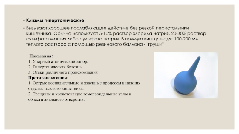 либо сульфата натрия. В прямую кишку вводят 100-200 мл теплого раствора с помощью резинового баллона - "груши"