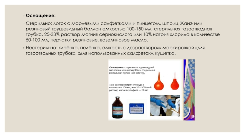 Нестерильно: клеёнка, пелёнка, ёмкость с дезраствором маркировкой «для газоотводных трубок», «для использованных салфеток», кушетка.