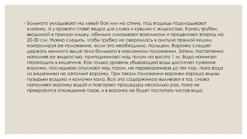 кувшин с жидкостью. Конец трубки, вводимой в прямую кишку, обильно смазывают вазелином и продвигают вперед на 20-30 см. Нужно следить, чтобы трубка не свернулась в ампуле прямой кишки, контролируя ее положение, если это необходимо, пальцем. Воронку следует держать немного выше тела больного в наклонном положении. Затем, постепенно наполняя ее жидкостью, приподнимают над телом на высоту 1 м. Вода начинает переходить в кишечник. Как только уровень убывающей воды достигнет сужения воронки, последнюю опускают над тазом, не переворачивая до тех пор, пока вода из кишечника не заполнит воронку. При таком положении воронки хорошо видны пузырьки воздуха и комочки кала. Все это содержимое выливают в таз, снова наполняют воронку водой и повторяют процедуру несколько раз, пока не прекратится отхождение газов, и в воронку не будет поступать чистая вода.