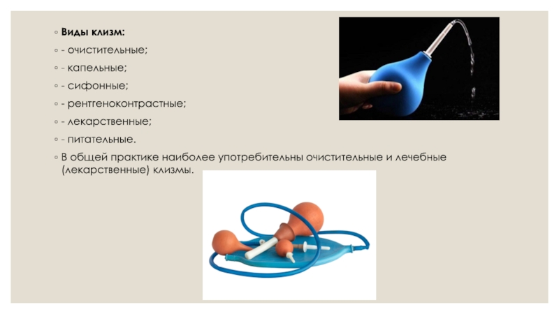 наиболее употребительны очистительные и лечебные (лекарственные) клизмы.