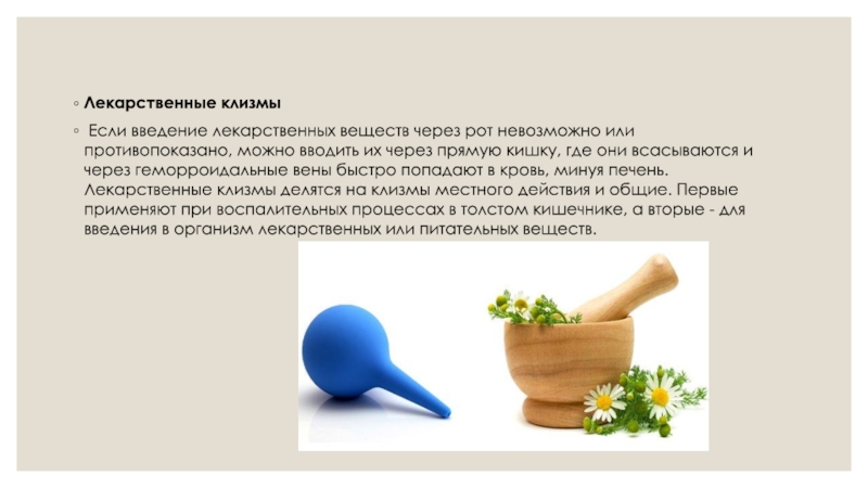 и через геморроидальные вены быстро попадают в кровь, минуя печень. Лекарственные клизмы делятся на клизмы местного действия и общие. Первые применяют при воспалительных процессах в толстом кишечнике, а вторые - для введения в организм лекарственных или питательных веществ.