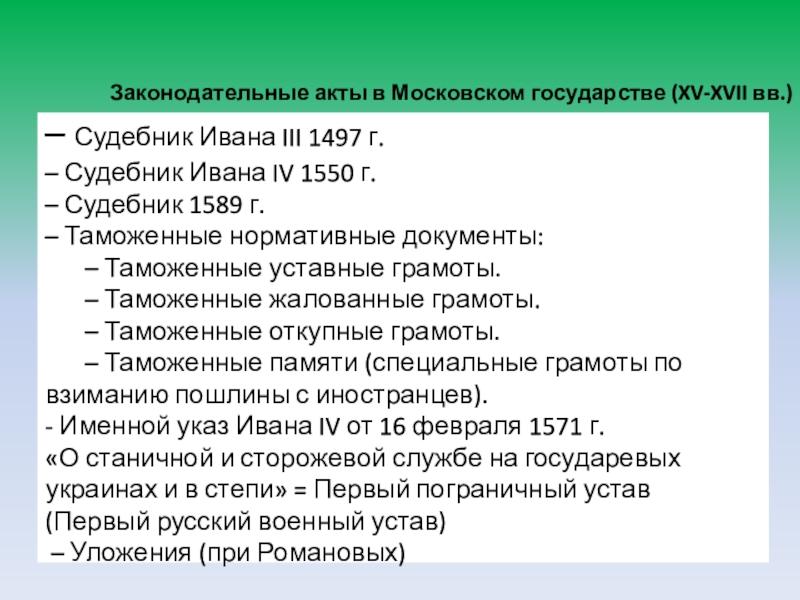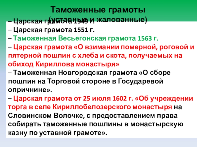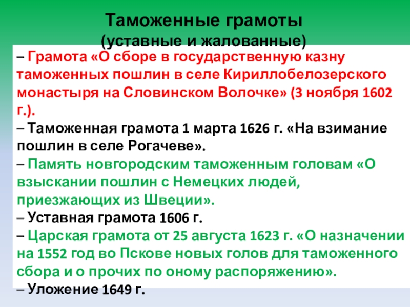 Складывание системы таможенных нормативных документов (таможенных грамот).