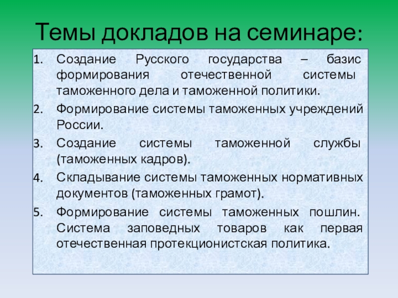 развития интеллектуальной мысли обучающихся в формате рассмотрения проблемных вопросов:Создание Русского государства – базис формирования отечественной системы таможенного дела и таможенной политики.