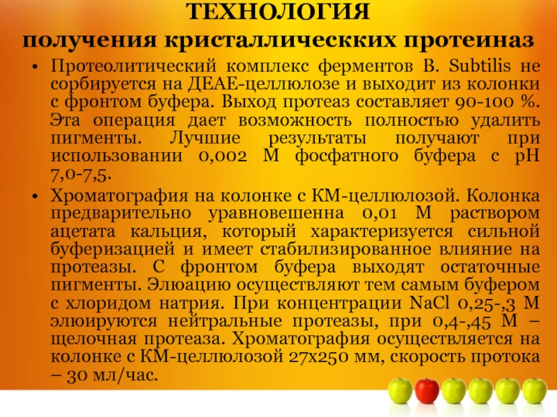 Хроматография на колонке с КМ-целлюлозой. Колонка предварительно уравновешенна 0,01 М раствором ацетата кальция, который характеризуется сильной буферизацией и имеет стабилизированное влияние на протеазы. С фронтом буфера выходят остаточные пигменты. Элюацию осуществляют тем самым буфером с хлоридом натрия. При концентрации NaCl 0,25-,3 М элюируются нейтральные протеазы, при 0,4-,45 М – щелочная протеаза. Хроматография осуществляется на колонке с КМ-целлюлозой 27х250 мм, скорость протока – 30 мл/час.