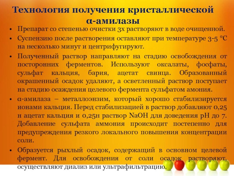 α-амилаза – металлоэнзим, который хорошо стабилизируется ионами кальция. Перед стабилизацией в раствор добавляют 0,25н ацетат кальция и 0,25н раствор NaOH для доведения рН до 7. Добавление сульфата аммония происходит постепенно для предупреждения резкого локального повышения концентрации соли.