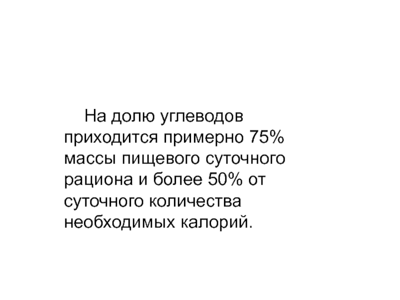 Слайд 4 На долю углеводов приходится примерно 75% массы пищевого суточного рациона