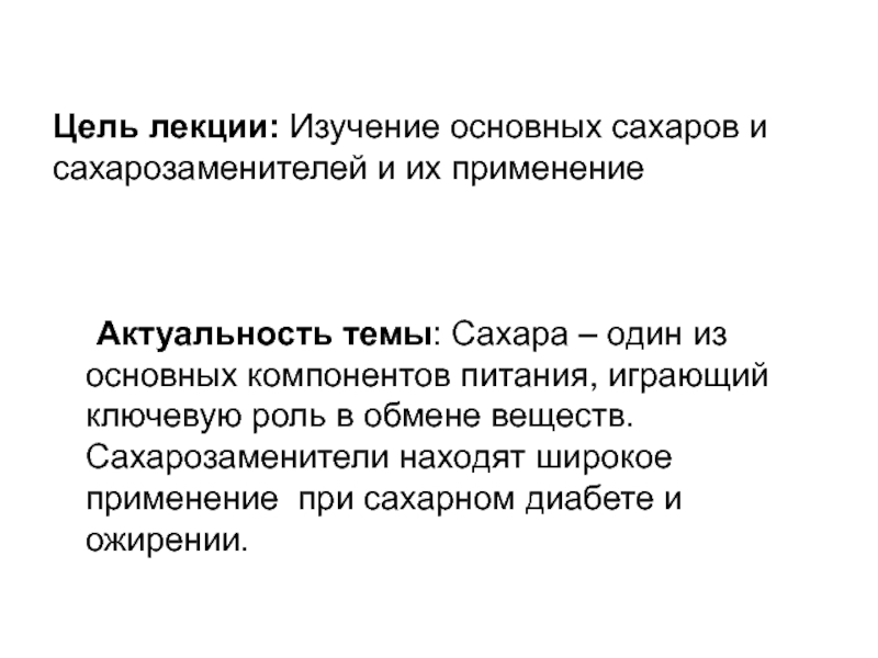 Слайд 2Цель лекции: Изучение основных сахаров и сахарозаменителей и их применение