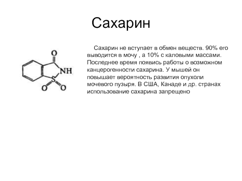появись работы о возможном канцерогенности сахарина. У мышей он повышает вероятность развития опухоли мочевого пузыря. В США, Канаде и др. странах использование сахарина запрещено