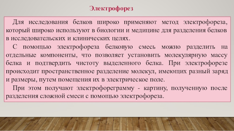 С помощью электрофореза белковую смесь можно разделить на отдельные компоненты, что позволяет установить молекулярную массу белка и подтвердить чистоту выделенного белка. При электрофорезе происходит пространственное разделение молекул, имеющих разный заряд и размеры, путем помещения их в электрическое поле.