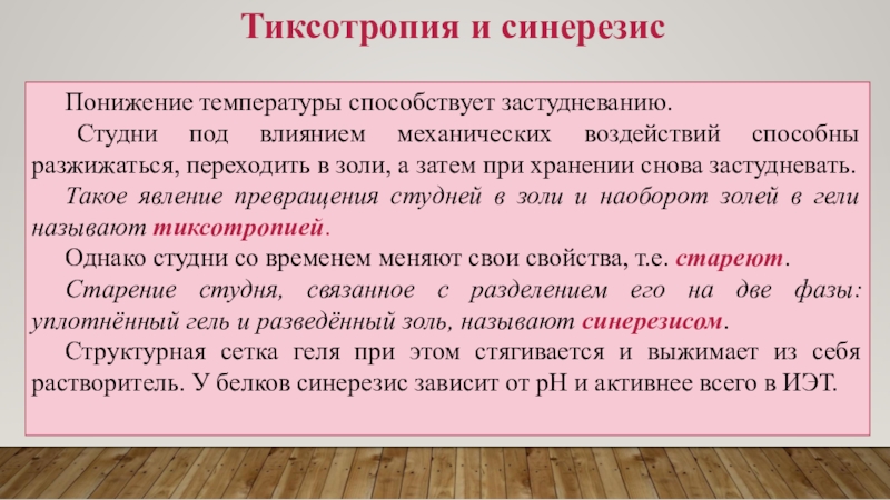 Структурная сетка геля при этом стягивается и выжимает из себя растворитель. У белков синерезис зависит от рН и активнее всего в ИЭТ.