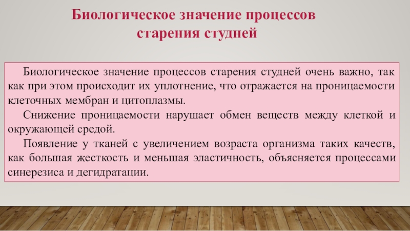 Слайд 39 Биологическое значение процессов старения студней очень важно, так как при