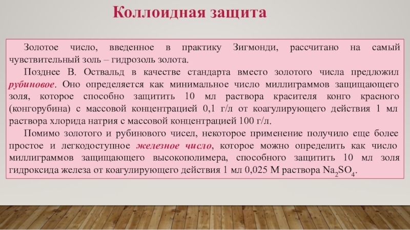 Помимо золотого и рубинового чисел, некоторое применение получило еще более простое и легкодоступное железное число, которое можно определить как число миллиграммов защищающего высокополимера, способного защитить 10 мл золя гидроксида железа от коагулирующего действия 1 мл 0,025 М раствора Na2SO4.