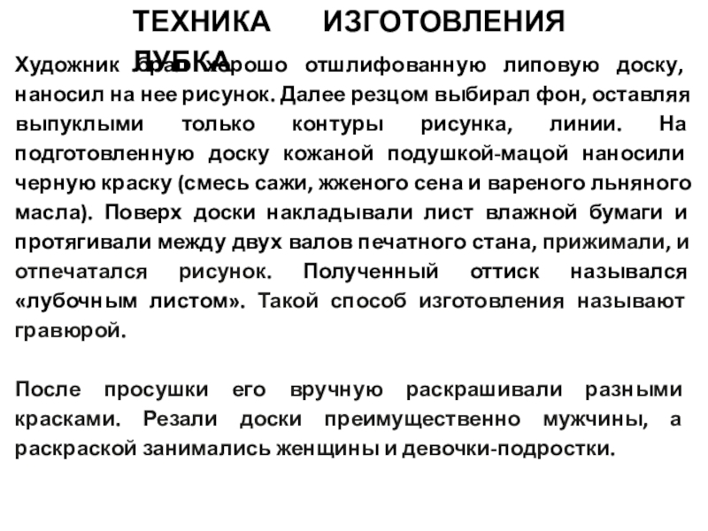 Слайд 21Художник брал хорошо отшлифованную липовую доску, наносил на нее рисунок.