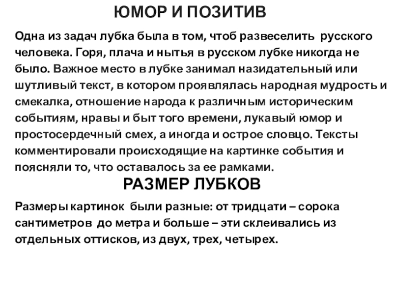 было. Важное место в лубке занимал назидательный или шутливый текст, в котором проявлялась народная мудрость и смекалка, отношение народа к различным историческим событиям, нравы и быт того времени, лукавый юмор и простосердечный смех, а иногда и острое словцо. Тексты комментировали происходящие на картинке события и поясняли то, что оставалось за ее рамками.