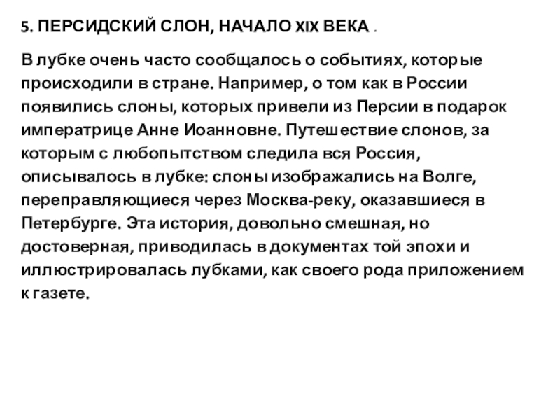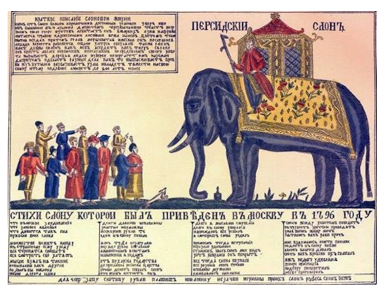 в России появились слоны, которых привели из Персии в подарок императрице Анне Иоанновне. Путешествие слонов, за которым с любопытством следила вся Россия, описывалось в лубке: слоны изображались на Волге, переправляющиеся через Москва-реку, оказавшиеся в Петербурге. Эта история, довольно смешная, но достоверная, приводилась в документах той эпохи и иллюстрировалась лубками, как своего рода приложением к газете.