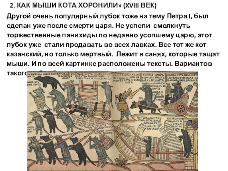 царя. Не успели смолкнуть торжественные панихиды по недавно усопшему царю, этот лубок уже стали продавать во всех лавках. Все тот же кот казанский, но только мертвый. Лежит в санях, которые тащат мыши. И по всей картинке расположены тексты. Вариантов такого лубка было множество.